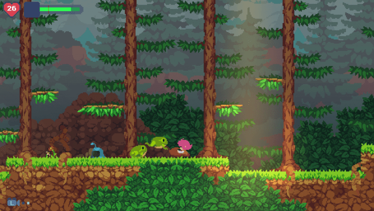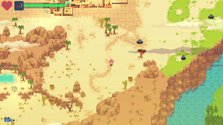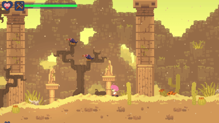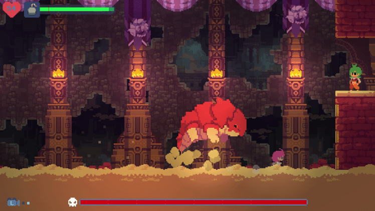 Club the pillaging bandits, bomb the burrowing sand drakes, snipe the flying evil eyes, and run from the hulking metal golem. The world of Phoenotopia, while beautiful, teems with danger. Caution is advised.